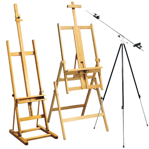 Easels are used as a vertical, and sometimes horizontal, support to either display finished artworks or to use as an actual working surface. Available in a wide range of sizes, from table top versions to collapsible for storage or transporting to giant easels that will support several hundred pounds and canvases over 7 ft, there should be something to suit any artist.